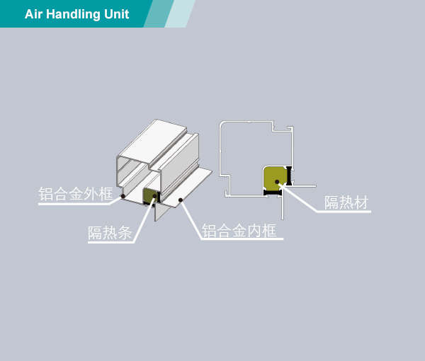 旺财28新一代MAH组合式空气处理机,艾洛斯(Aiolos)系列,采用防冷桥铝合金框架结构设计,面板与框架为压扣连接方式。